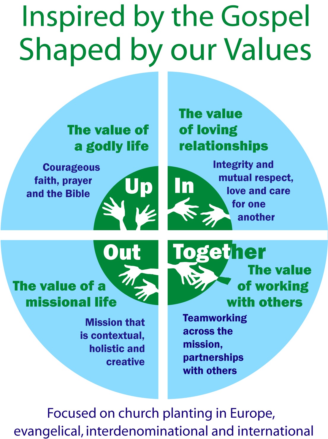 These four values - a life oriented to God, integrity and mutual respect in our relationships, mission to the peoples of Europe through church planting, and collaboration are the core values of ECM. They are expressed in simple, modern language as UP, IN, OUT, TOGETHER, but they rest on ancient foundations, namely the four marks of the church as expressed in the Nicene Creed.
